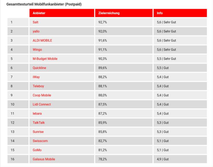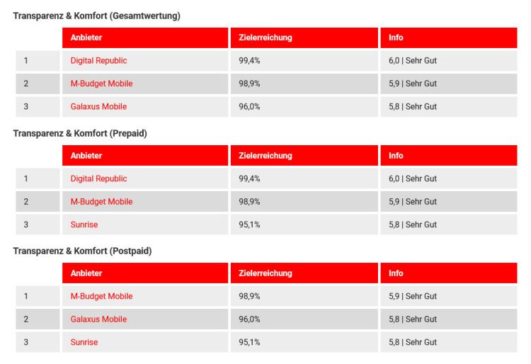Beim Kriterium Transparent & Komfort erzielte derweil insgesamt Digital Republic, gefolgt von M-Budget Mobile und Galaxus Mobile die besten Werte. Die besten Konditionen bietet in der Gesamtwertung der Anbieter GoMo, vor Aldi Mobile und Galaxus Mobile, während bei der Bewertung des Telefon-Kundendienstes insgesamt Yallo die Nase vorn hatte, eben auf mit den Anbietern iWay und M-Budget Mobile.