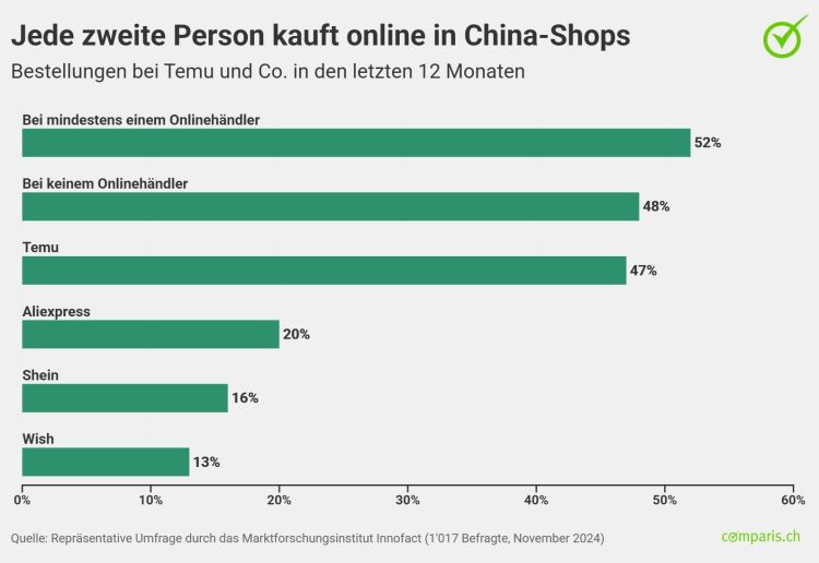 Comparis hat im Rahmen einer repräsentativen Befragung das Einkaufsverhalten der Schweizer Bevölkerung bei den chinesischen Shops Aliexpress, Shein, Temu und Wish untersucht. Demnach haben 52 Prozent der Befragten im letzten Jahr bei mindestens einem dieser Shops etwas bestellt. Am beliebtesten dabei: