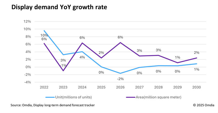 Die Marktanalysten von Omdia haben den Display-Markt unter die Lupe genommen und gehen davon aus, dass der Absatz von Displays im kommenden Jahr um zwei Prozent nachgeben wird, wobei keine konkreten Zahlen genannt werden. Allerdings soll die verkaufte Display-Fläche gleichzeitig um 6 Prozent zunehmen, was auf den Trend in Richtung immer grösserer Displays verweist. Für die nachfolgenden Jahre bis 2030 rechnen die Analysten dann mit einem minimalen Absatzwachstum, das bis 2030 gerade einmal einen Prozentpunkt erreichen soll. Im selben Zeitrahmen soll die Gesamtfläche der Displays weiterhin zulegen, allerdings ebenfalls nur mit Wachstumsraten im tiefen einstelligen Prozentbereich.
