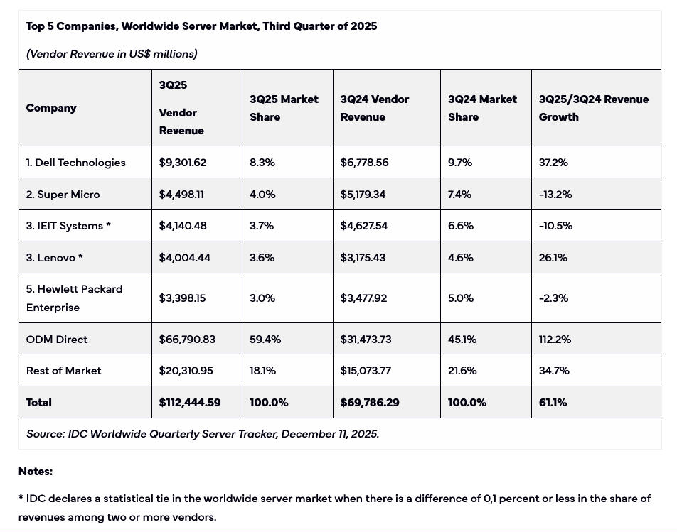 Die Liste der erfolgreichsten Serverhersteller wurde auch im Q3 von Dell mit einem Umsatz von 9,3 Milliarden Dollar angeführt. Allerdings wuchsen die Texaner mit einem Plus von 37 Prozent deutlich weniger stark als der Gesamtmarkt, wodurch sich der Marktanteil innert Jahresfrist von 9,7 auf 8,3 Prozent verringerte. Auf den Plätzen zwei und drei folgen die beiden im Data-Center-Bereich tätigen Hersteller Super Micro und IEIT Systems mit Marktanteilen von 4 und 3,7 Prozent, gefolgt von Lenovo und HPE mit Anteilen von 3,6 respektive 3 Prozent. (rd)