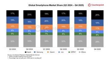 Mit einem Marktanteil von 25 Prozent im vierten Quartal 2025 führte Apple den Markt deutlich an und wuchs um 14 Prozent gegenüber dem Vorjahr. Ausschlaggebend war vor allem die Nachfrage nach der iPhone-17-Serie. Samsung belegte mit einem Marktanteil von 18 Prozent den zweiten Platz und erzielte mit 17 Prozent das stärkste Wachstum unter den fünf grössten Anbietern. Xiaomi hielt mit 11 Prozent Marktanteil Rang drei, verzeichnete jedoch einen Rückgang von 11 Prozent im Jahresvergleich. Lieferengpässe und Wettbewerbsdruck in wichtigen Märkten belasteten das Volumen, so Counterpoint. (mw)