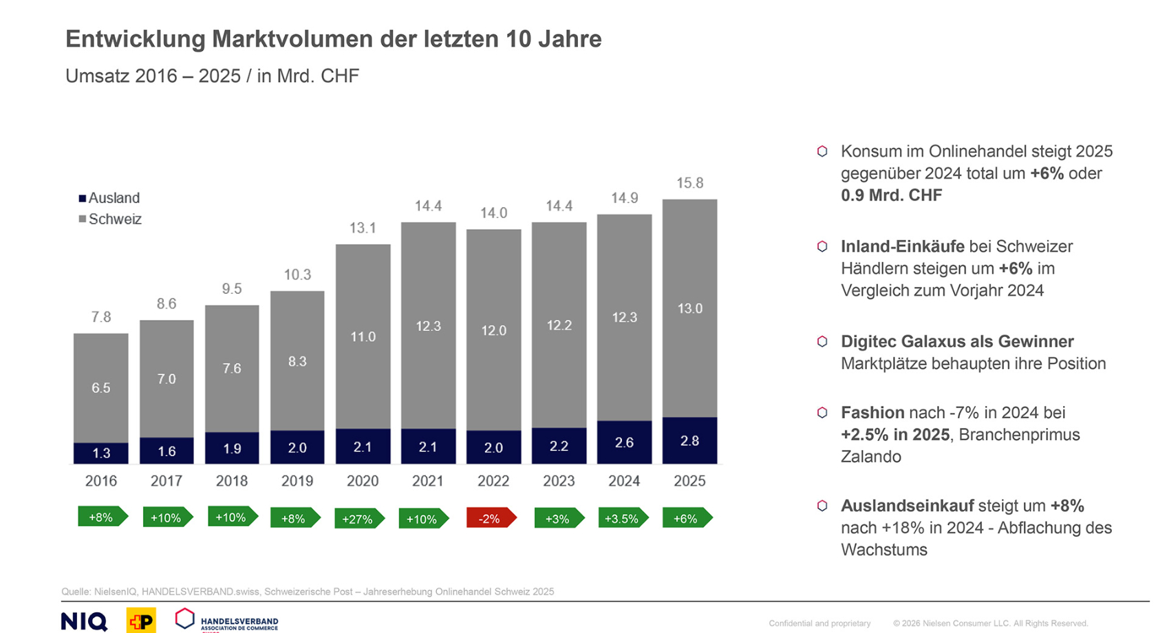Im Schweizer E-Commerce gab es auch 2025 einen moderaten, aber stabilen Wachstumspfad. Zu diesem Schluss kommt die Jahreserhebung Onlinehandel Schweiz, durchgeführt von Handelsverband.swiss, NielsenIQ und der Schweizerischen Post. Das Volumen des Onlinehandels betrug demnach in der Schweiz im vergangenen Jahr 15,8 Milliarden Franken, ein Plus von 6 Prozent gegenüber 2024. Inlandkäufe bei Schweizer Händlern (+6 %, insgesamt CHF 13 Mrd.) und Einkäufe von Kunden bei ausländischen Onlinehändlern (+8 %, 2,8 Mrd.) hätten dabei fast gleich stark zugelegt, stellt die Studie weiter fest. Gleichzeitig habe sich nach dem aussergewöhnlich starken Anstieg 2024 eine spürbare Abflachung gezeigt.