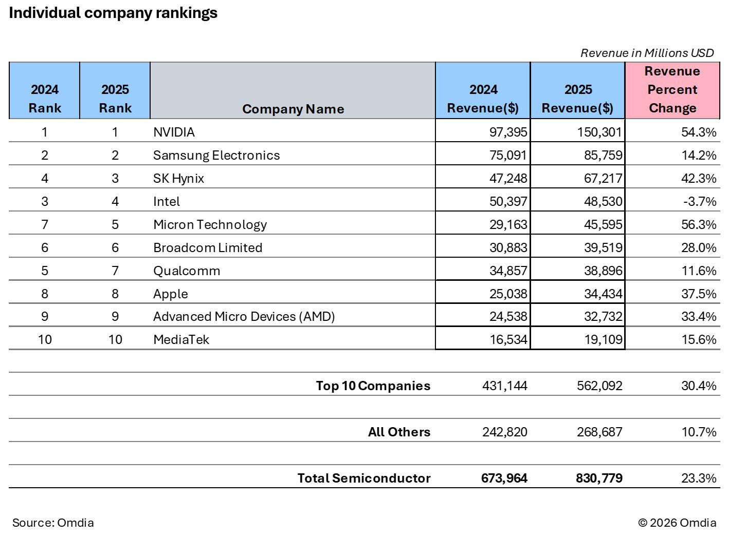 Der starke Umsatzanstieg seit 2023 führte zudem zu einer zunehmenden Marktkonzentration bei den grössten Halbleiteranbietern. Während der Gesamtmarkt zwischen 2023 und 2025 um rund 53 Prozent zulegte, stiegen die Umsätze der zehn grössten Halbleiterunternehmen im gleichen Zeitraum um 90 Prozent. Der restliche Markt legte dagegen nur um etwa 8 Prozent zu.