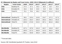 Bei der Prognose der Desktop-PC-Verkäufe zeigen sich interessante Unterschiede zwischen der Entwicklung in den USA und jener in der restlichen Welt: In den Staaten werden in den nächsten Jahren stetig weniger Desktop-Rechner abgesetzt. Die Zahl sinkt laut Prognose kontinuierlich von 27,5 Millionen im vergangenen Jahr auf 25,5 Millionen im Jahr 2014. Ausserhalb der USA soll dieses Jahr noch ein Plus von über 10 Prozent erreicht werden. Doch die Kurve wird auch hier flacher bis die Desktop-Verkäufe im Jahr 2014 dann ebenfalls stagnieren werden.
