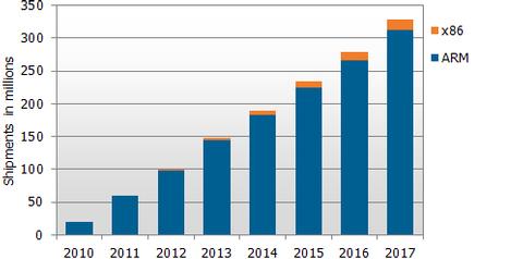 Display Search erwarten nicht, dass sich Windows-Tablets mit Intels x86-Prozessoren in den kommenden Jahren durchsetzen werden. Gemäss einer aktuellen Studie sollen im Jahr 2012 insgesamt 1,8 Millionen davon verkauft werden, was einem Marktanteil von 1,8 Prozent entspräche (siehe Graphik). Zum Vergleich: Der gesamte Tablet-Markt soll 2012 nach Schätzungen der Marktforscher ein Volumen von 100 Millionen Geräten erreichen. Marktführer bei den Tablet-Prozessoren ist der britische Chip-Designer ARM. Dieser soll dieses Jahr knapp 60 Millionen ARM-Tablets in den Handel bringen, was mehr als eine Verdoppelung im Vergleich zum Vorjahr wäre.
