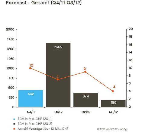 Auch für die ersten Monate 2012 zeigt sich Active Sourcing optimistisch, danach soll aber wieder eine schwächere Phase folgen. Der Gesamt-TCV für 2012 wird sich auf 2674 Millionen Franken und 30 Verträge belaufen. Dabei wird insbesondere in der Finanzindustrie ein Erneuerungsgeschäft in der Grössenordnung von einer Milliarde Franken erwartet.