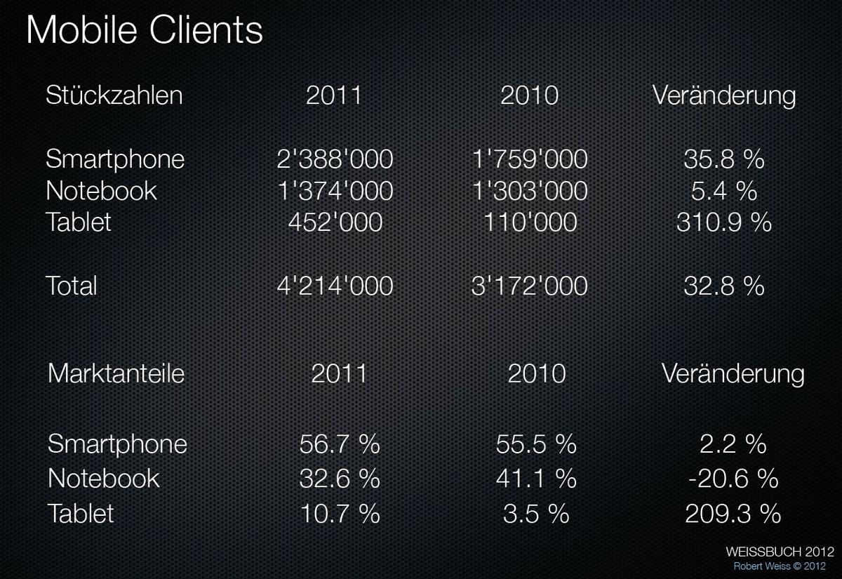 Ausserdem werden im Weissbuch auch Zahlen zum Schweizer Handy- und Smartphone-Markt veröffentlicht. Im Gesamtmarkt wurden hier 2011 4,372 Millionen Geräte verkauft (plus 2,8%), wovon es sich bei 2,388 Millionen Geräte um Smartphones handelte (plus 35,8 Prozent). Der Smartphone-Anteil steigerte sich damit von 41,3 Prozent im Jahr 2010 auf 54,6 Prozent. Am häufigsten wurden dabei Smartphones mit dem Betriebssystem iOS verkauft (1,187 Millionen Stück, plus 43,4% gegenüber 2010), während 940'500 Android-Geräte über den Ladentisch gingen (plus 137,8%). Auf Windows Phone, Blackberry und Co. entfallen 238'000 Stück (minus 55,1%).