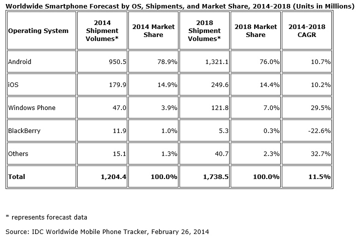 Wie die IDC-Studie weiter zeigt, wird sich das sinkende Wachstum nicht bei allen Plattformen gleichermassen bemerkbar machen. So werden für die Jahre 2014 bis 2018 die durchschnittlichen jährlichen Zuwachsraten bei iOS- und Android-Geräten im Durchschnitt bei rund 10 Prozent veranschlagt, wodurch sich die Marktanteile von 14,9 auf 14,4 Prozent beziehungsweise von 78,9 auf 76 Prozent verringern werden. Anders Microsofts Windows-Phone-Plattform: Hier prognostiziert IDC mittlere jährliche Zuwachsraten von rund 29 Prozent, womit der Marktanteil von 3,9 Prozent im laufenden auf 7 Prozent im Jahr 2018 klettern soll.