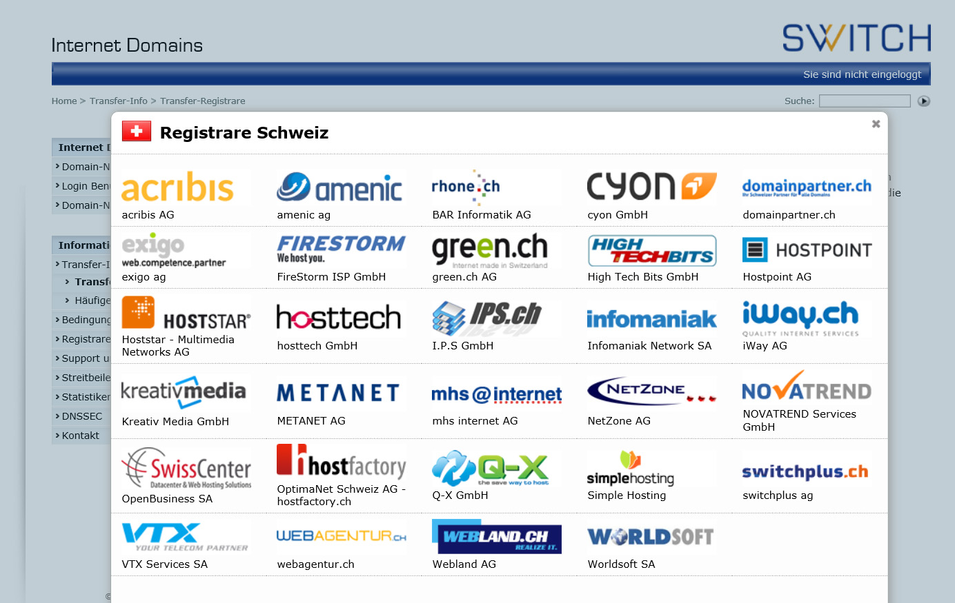 dieser Seite findet man ausserdem eine Liste aller Registrare, die gemäss Switch beim Transfer der .ch-Domain-Namen mitmachen und zu denen man seine Domain-Namen transferieren kann.