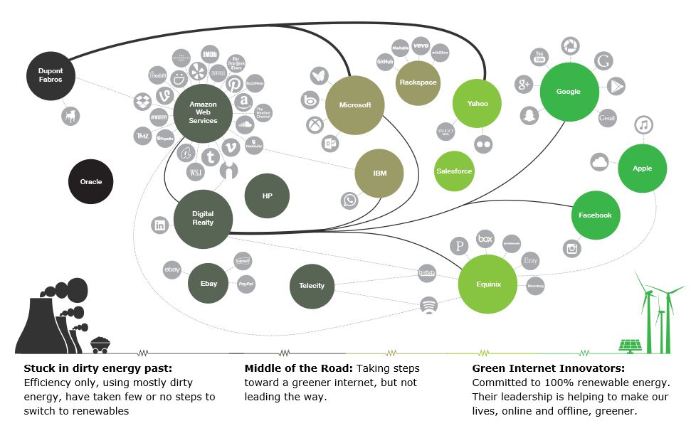 Google und Facebook noch längst nicht am Ziel angelangt, die Cloud zu 100 Prozent über erneuerbare Energien zu versorgen. Immerhin aber schaffen sie es auf einen Anteil von 49 Prozent (Facebook) und 46 Prozent (Google), der Rest der Energie kommt von Gas, Kohle und Atomkraftwerken.