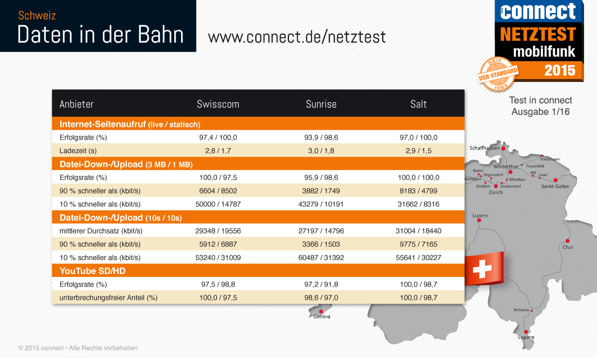 Swisscom – haben mit der Note "sehr gut" abgeschnitten. Swisscom kann dabei zudem seine Position an der Spitze verteidigen – zum siebten Mal in Folge und vor allem dank besserer Performance im Bereich Daten. Zudem profitiere Swisscom davon, dass man derzeit als einziger Schweizer Telco im eigenen LTE-Netz bereits die moderne Sprachu¨bertragungstechnik VoLTE anbiete. Das gute Resultat führt zudem dazu, dass Swisscom im Drei-Länder-Vergleich – auch die Netze in Deutschland und Österreich wurden erneut untersucht – den Gesamtsieg schafft.