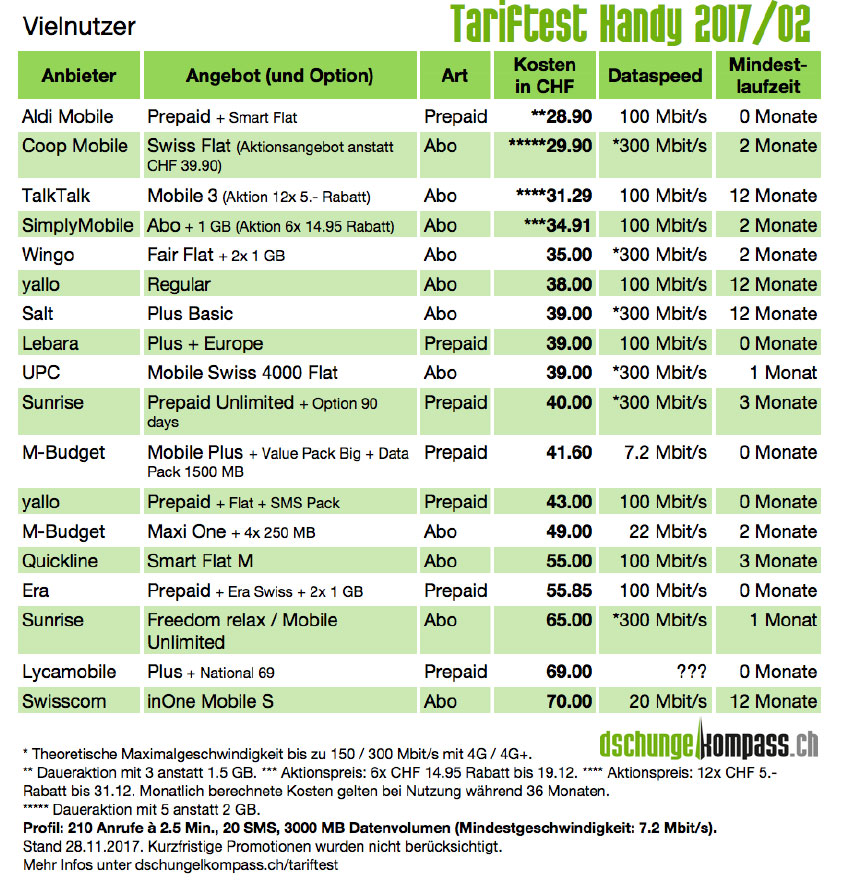 Dschungelkompass.ch geht bei seinen Berechnungen von sechs typischen Nutzerprofilen aus und berechnet die günstigen Anbieter im Abo- und im Prepaid-Modell. Ein Wenignutzer (monatlich 30 Anrufe, 20 SMS, 300 MB Datenvolumen mit min. 7,2 Mbit/s) fährt aktuell am besten mit dem Prepaid-Abo Sunrise Prepaid Airbag mit Budget 15, das 15 Franken kostet. 15.90 bezahlt man mit