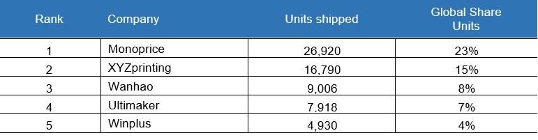 Im Jahr 2017 begann der Markt ausserdem, neue Produktklassen zu erkennen und ging über die Einteilung der Kategorien mittels Preisgrenze von 5000 US-Dollar hinweg, um Schlüsselsegmente zu definieren. Zu den führenden Unternehmen in der neuen Professional-Klasse, die Geräte im Wert von 2500 bis 20000 US-Dollar umfasst, gehören Formlabs, Ultimaker, Leapfrog, Makerbot und Markforged. Während in allen vier neuen Unterklassen die Druckerlieferungen in diesem Zeitraum zunahmen, verzeichnete diese Klasse ein Wachstum von 162 Porzent im Vergleich zum Vorjahr, da Marken wie Ultimaker zu höheren Preispunkten wechselten, was die relative Unelastizität der Preisgestaltung in dieser Produktklasse zeigt.