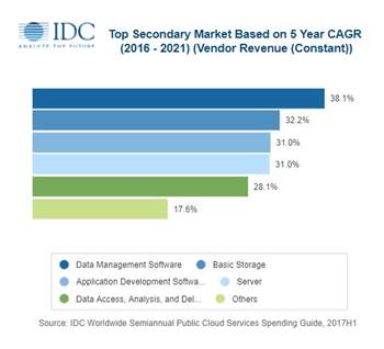 Wie die Studienverfasser festhalten, wird auch im laufenden Jahr der Grossteil der Cloud-Investitionen von knapp zwei Dritteln auf den Bereich Software-as-a-Service entfallen. Auf den weiteren Plätzen folgen die Bereiche Infrastructure-as-a-Service sowie Platform-as-a-Service, wobei IDC die Anteile hier nicht näher beziffert. Als die über die Untersuchungsperiode am schnellsten wachsenden Marktsegmente bezeichnen die Analysten derweil Data Management Software mit einer mittleren jährlichen Wachstumsrate von 38 Prozent, gefolgt von Basic Storage (32%) sowie Application Development Software (31%).