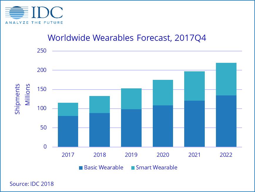 Die meistverkauften Geräte werden auch 2018 die Smartwatches sein, die laut den Marktanalysten von IDC mit 43,6 Millionen verkauften Einheiten 38,2 Prozent des gesamten Marktvolumens ausmachen werden. Der Anstieg wird mit dem wachsenden Verständnis der Konsumenten für den Nutzen solcher Geräte begründet. Im Vordergrund stehe nach wie vor die Nutzung im Fitness-Bereich, aber Funktionalitäten wie das mobile Bezahlen oder das Instant Messaging würden stetig an Relevanz gewinnen.