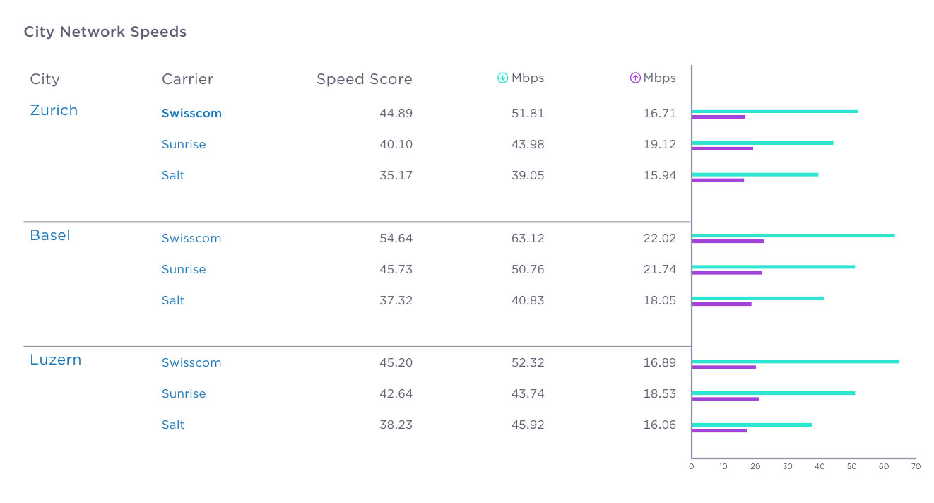 Swisscom als den Anbieter mit dem schnellsten Mobilfunknetz der Schweiz. Für den Vergleich wurden hierzulande zwischen Juli und Dezember über 450'000 Messungen durchgeführt, wobei neben Swisscom auch