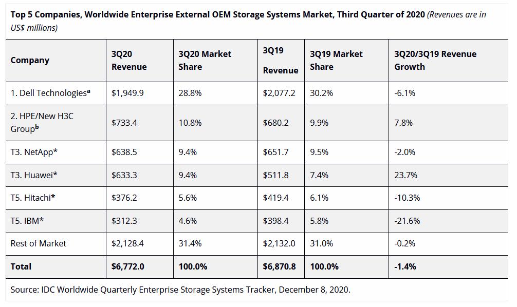 Netapp auf Rang drei weist IDC einen Umsatz von 638 Millionen aus (minus 2%), für Huawei auf Rang vier 633 Millionen (plus 23,7%) – beide kommen auf einen Marktanteil von 9,4 Prozent. Danach folgen