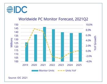 Fürs gesamte 2021 rechnet IDC mit einem Absatz von etwas über 147 Millionen PC-Monitoren, was dem höchsten Volumen seit 2012 entsprechen würde. In den Jahren danach wird der Absatz jedoch wieder zurückgehen, so die Marktforscher, und zwar bis auf 139 Millionen Einheiten im Jahr 2025.