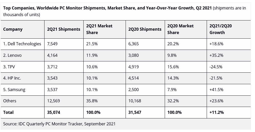 Im zweiten Quartal dieses Jahres wurden weltweit 35,07 Millionen PC-Monitore verkauft. Das sind 11,2 Prozent mehr als vor Jahresfrist, als 31,55 Millionen Displays abgesetzt wurden. Marktführer im Q2 2021 war