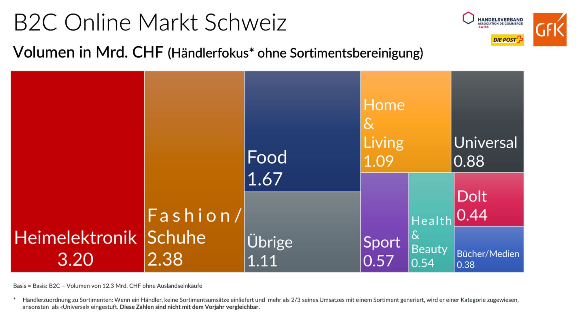 Der Löwenanteil des Volumens, nämlich 12,3 Milliarden Franken, entfällt auf Bestellungen bei Schweizer Anbietern, 2,1 Milliarden gingen an Online-Händler im Ausland. Bei Non-Food-Artikeln liegt der Online-Anteil nun bei 18,1 Prozent, bei Food sind es 3,8 Prozent. Im Sortiment Heimelektronik und Haushaltgeräte wird mittlerweile jeder zweite Franken online ausgegeben, bei Mode und Schuhen sind es 30 Prozent und bei Home und Living rund 17 Prozent des Gesamtmarktvolumens. Dessen ungeachtet bleibt der stationäre Handel in nahezu allen Segmenten der bevorzugte Einkaufskanal der Schweizer.