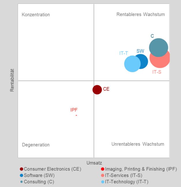 Auch Software (minus 1,3 Punkte) findet sich mit 120,5 Punkten nach wie vor in einer komfortablen Zone. Darauf folgen IT Technology (120,8, plus 5,2 Punkte) sowie, nur noch knapp über der Wachstumsgrenze, Consumer Electronics mit 101,6 Punkten – immerhin 5,7 Punkte mehr als beim letzten ICT Index. Klar unter der Wachstumszone angesiedelt ist die Teilbranche Imaging, Printing und Finishing mit einem unveränderten Stand von 88,5 Punkten.