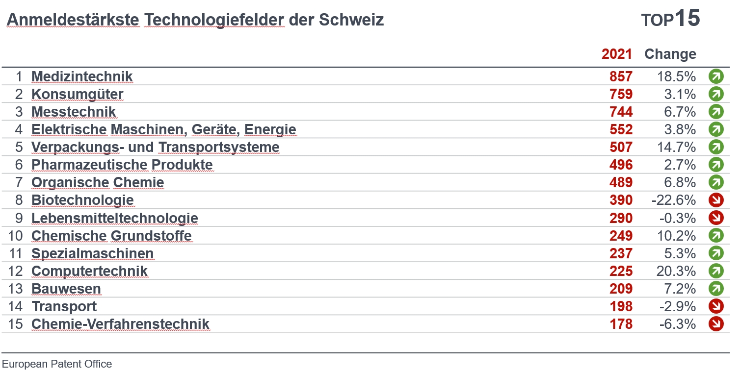 Besonders deutlich stieg die Zahl der Patentanmeldungen im Bereich der Medizintechnik, der ein Plus von 18,5 Prozent verbuchen konnte, nachdem es dort im Vorjahr noch einen kräftigen Rückgang von 13,1 Prozent gegeben hatte. Medizintechnik avanciert damit zum ersten Mal seit einem Jahrzehnt zum Technologiefeld mit den meisten Patentanmeldungen. Auf Platz zwei liegen derweil die Konsumgüter, die vom ersten Platz verdrängt wurden und wo das Plus der Patentanmeldungen 3,1 Prozent betrug. Am anderen Ende des Spektrums verzeichnete die Biotechnologie den grössten Rückgang unter allen Technologiefeldern (-22,6%).