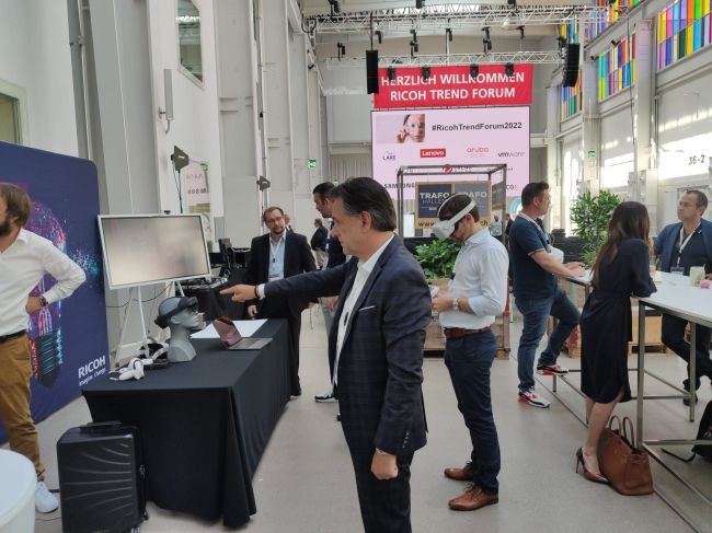 Ricoh und eine Auswahl seiner Partner waren mit Themenständen vertreten, wo sie eine Auswahl ihrer Produkte präsentierten. Dabei gab es auch spielerische Gadgets wie einen Rollkoffer, der den Benutzer scannt und fortan verfolgt, zu bestaunen und testen. Somit bot auch der Nachtmittag viel Spannendes und Lehrreiches.