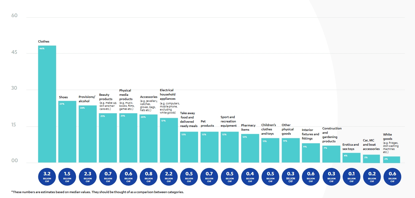 Hingegen fielen die Umsätze im Warenhandel – mit 16 Milliarden Franken nach wie vor der grösste Posten – um 5 Prozent. Online-Einkäufe von Lebensmitteln und Alkohol gaben dabei um 29 Prozent auf 2,3 Milliarden Franken nach. "Pandemiebedingt haben sich viele Einkäufe im ersten Pandemiejahr in den Online-Kanal verschoben. Mit der zunehmenden Mobilität hat das Pendel wieder zurückgeschlagen und der stationäre Handel konnte Umsätze zurückgewinnen", begründet Marianne Bregenzer, Country Director von Nets Schweiz, die Entwicklung. Rückläufig entwickelten sich auch die Online-Umsätze mit Büchern, Filmen und Musik, die um 21 Prozent auf 600 Millionen Franken nachgaben. Als beliebteste Online-Einkäufe erwiesen sich hingegen nach wie vor Kleider, für die letztes Jahr 3,2 Milliarden Franken ausgegeben wurden; 46 Prozent der Befragten erklärten, in den letzten 28 Tagen übers Web Kleider gekauft zu haben.