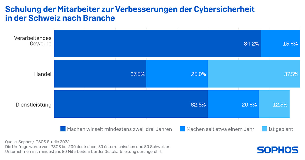 Als wichtigste Massnahme zur Verbesserung der Cybersicherheit bezeichnen 66,7 Prozent der Befragten in der Schweiz die Schulung der Mitarbeitenden und sagen gleichzeitig, sie würden das Security Awareness Training seit mindestens zwei bis drei Jahren betreiben. Den Spitzenplatz nimmt auch hier das verarbeitende Gewerbe ein (84,2 %), der Handel dagegen liegt mit 37,5 Prozent deutlich darunter, Dienstleister mit 62,5 Prozent nahe am Durchschnitt.