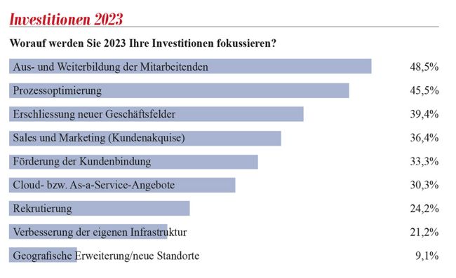 Ein weiterer Themenblock, der uns hinsichtlich 2023 interessiert hat, betrifft die geplanten Investitionen. Diese decken sich mit den Herausforderungen, nennt doch fast jedes zweite Unternehmen, dass 2023 Investitionen auf die Aus- und Weiterbildung der Mitarbeitenden fokussiert werden sollen – der Fachkräftemangel lässt grüssen. Im letzten Jahr war dieser Anteil übrigens bereits ähnlich hoch. Häufig genannt wurde bei der diesjährigen Umfrage auch das Thema Prozessoptimierung, in die investiert werden soll. Das macht vor dem Hintergrund zunehmend schmalerer Margen und Rezessionsängste absolut Sinn. Hand in Hand gehen die beiden ebenfalls oft genannten Investitionsthemen «Erschliessung neuer Geschäftsfelder» sowie «Sales und Marketing» hinsichtlich Kundenakquise. Die Förderung der Kundenbindung steht ebenfalls relativ hoch auf der Agenda, gefolgt von geplanten Investitionen in Cloud- beziehungsweise As-a-Service-Angebote, die knapp jedes dritte Unternehmen, das an der Umfrage teilgenommen hat, plant.