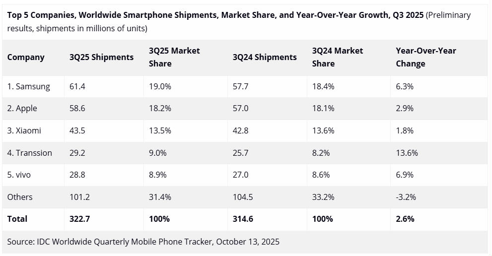 Samsung lag im Q3 mit 61,4 Millionen ausgelieferten Geräten (plus 6,3 %) und einem Marktanteil von 19 Prozent an der Spitze. Apple folgt mit einem Plus von 2,9 Prozent und 58,6 Millionen Geräten (18,2 Prozent Marktanteil). Auf den weiteren Plätzen lagen Xiaomi (13,5 %, plus 1,8 %), Transsion (9 %, plus, 13,6 %) und Vivo (8,9 %, plus 6,9 %). Die übrigen Hersteller machten zusammen 31,4 Prozent des Marktes aus und lieferten 3,2 Prozent weniger Geräte aus.