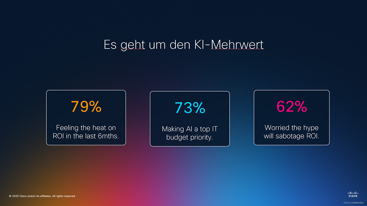 Cisco, generalisiert: "Der diesjährige Cisco AI Readiness Index verdeutlicht eines: KI ist nicht das Problem, sondern die fehlende Bereitschaft dafür. Die KI-Vorreiter aus unserer Studie beweisen das. Sie bringen Pilotprojekte viermal häufiger in die Produktion und erzielen 50 Prozent häufiger messbaren Mehrwerte."