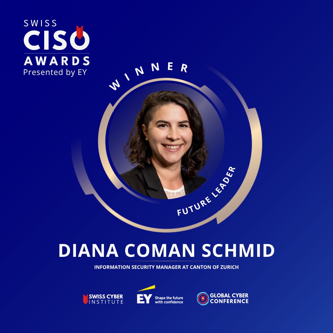 Den Award als Future Leader durfte Diana Coman Schmid, Information Security Manager beim Kanton Zürich, entgegennehmen. Coman Schmid repräsentierte die nächste Generation der Cybersicherheitsführung, wie es heisst. Hervorgehoben wird ihre Herangehensweise, die als strategisch, datengestützt und kooperativ beschrieben wird. "Diana Coman Schmids Arbeit ist ein Beispiel dafür, wie strenge Sicherheitspraktiken Innovation und Vertrauen in öffentliche Institutionen fördern können", wie es weiter heisst.