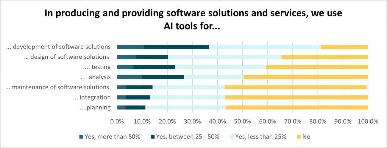 Letztes Jahr stand die Nutzung von KI in der Softwareindustrie im Zentrum der Studie. In diesem Jahr hat sich die KI-Nutzung verdoppelt. Mehr als 80 Prozent der Schweizer Softwareunternehmen setzen in der Softwareentwicklung KI ein. Dabei überlassen mehr als die Hälfte der befragten Unternehmen (52,5 %) ihren Mitarbeitenden die Wahl der KI-Tools – bei klassischen IT-Tools fällt die Entscheidungsfreiheit mit 36,9 Prozent deutlich geringer aus.