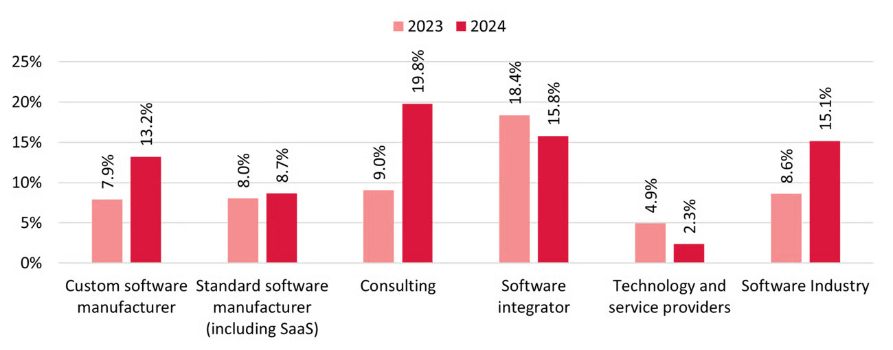 Die Studie gibt auch Auskunft über allgemeine Kennzahlen. So bleiben die Wachstumserwartungen der Schweizer Softwareunternehmen einmal mehr positiv: sie erwarten für 2025 ein Plus von 4,3 Prozent und für 2026 ein Wachstum von 9 Prozent. Rückblickend lag die EBIT-Marge allerdings auch 2024 unter 10 Prozent, was dem Niveau der Vorjahre entspricht. Zugenommen hat 2024 dagegen die Fluktuation in der Schweizer Softwarebranche. So haben 15,1 Prozent der Mitarbeitenden ihr Unternehmen verlassen. Im Vorjahr 2023 waren es nur 8,6 Prozent. Am höchsten war die Fluktuationsrate bei Beratungsunternehmen, nämlich 19,8 Prozent. Erfasst wurden dabei sowohl freiwillige Kündigungen als auch Entlassungen.