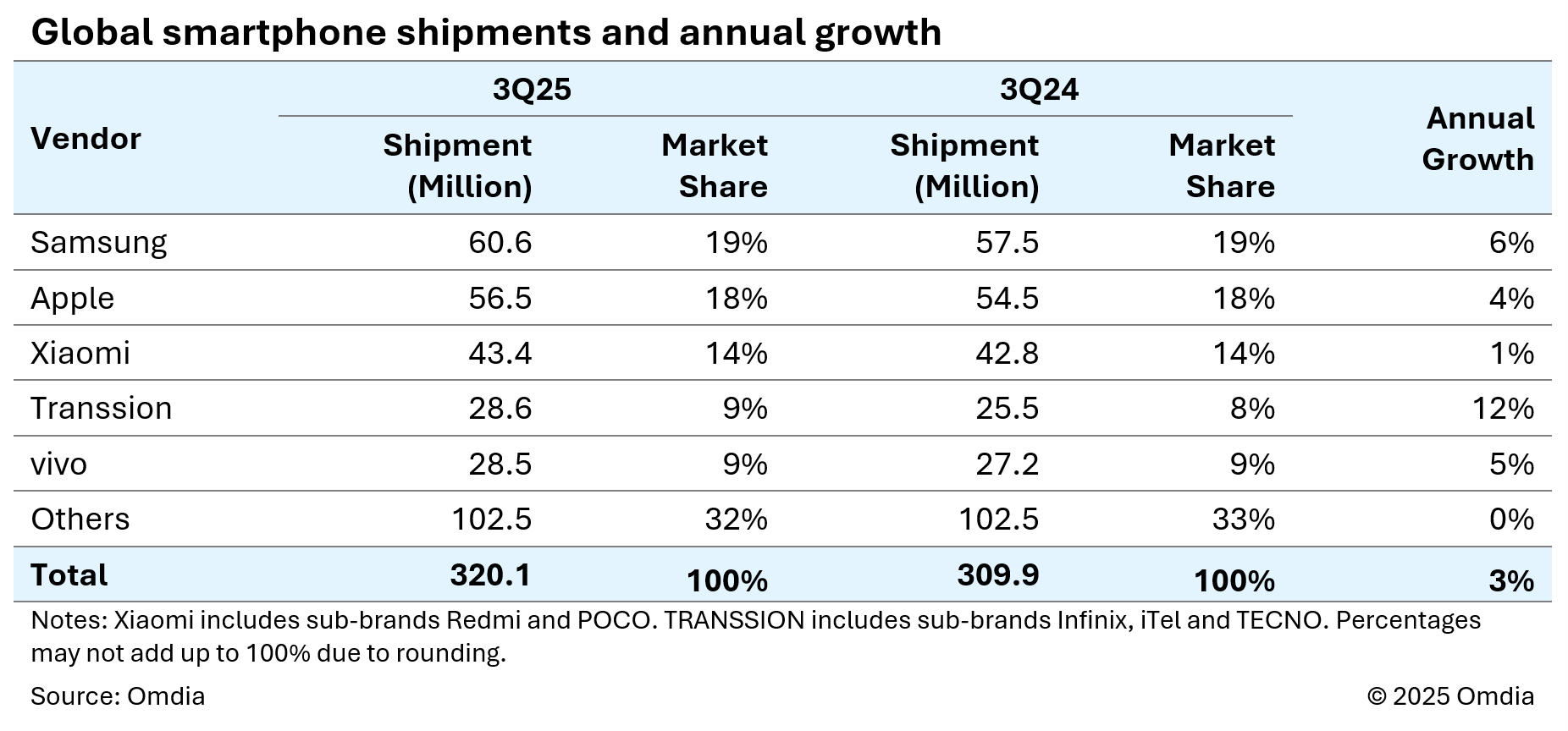Omdia verzeichnete der globale Smartphone-Markt im dritten Quartal 2025 ein Wachstum von drei Prozent im Vergleich zum Vorjahr. Insgesamt wurden 320,1 Millionen Geräte ausgeliefert, wobei das Wachstum vor allem von Schwellenländern getragen wird, so Omidia.