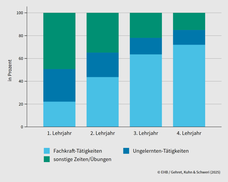 Die produktiven Tätigkeiten, die sonst von Fachkräften erledigt werden müssten, machen im ersten Lehrjahr nur 22 Prozent der Zeit am betrieblichen Arbeitsplatz aus, steigen bis im vierten Lehrjahr dann auf 72 Prozent. Der Leistungsgrad gegenüber einer voll ausgebildeten Fachkraft liegt im vierten Lehrjahr bei 71 Prozent, gegenüber 21 Prozent im ersten Lehrjahr.