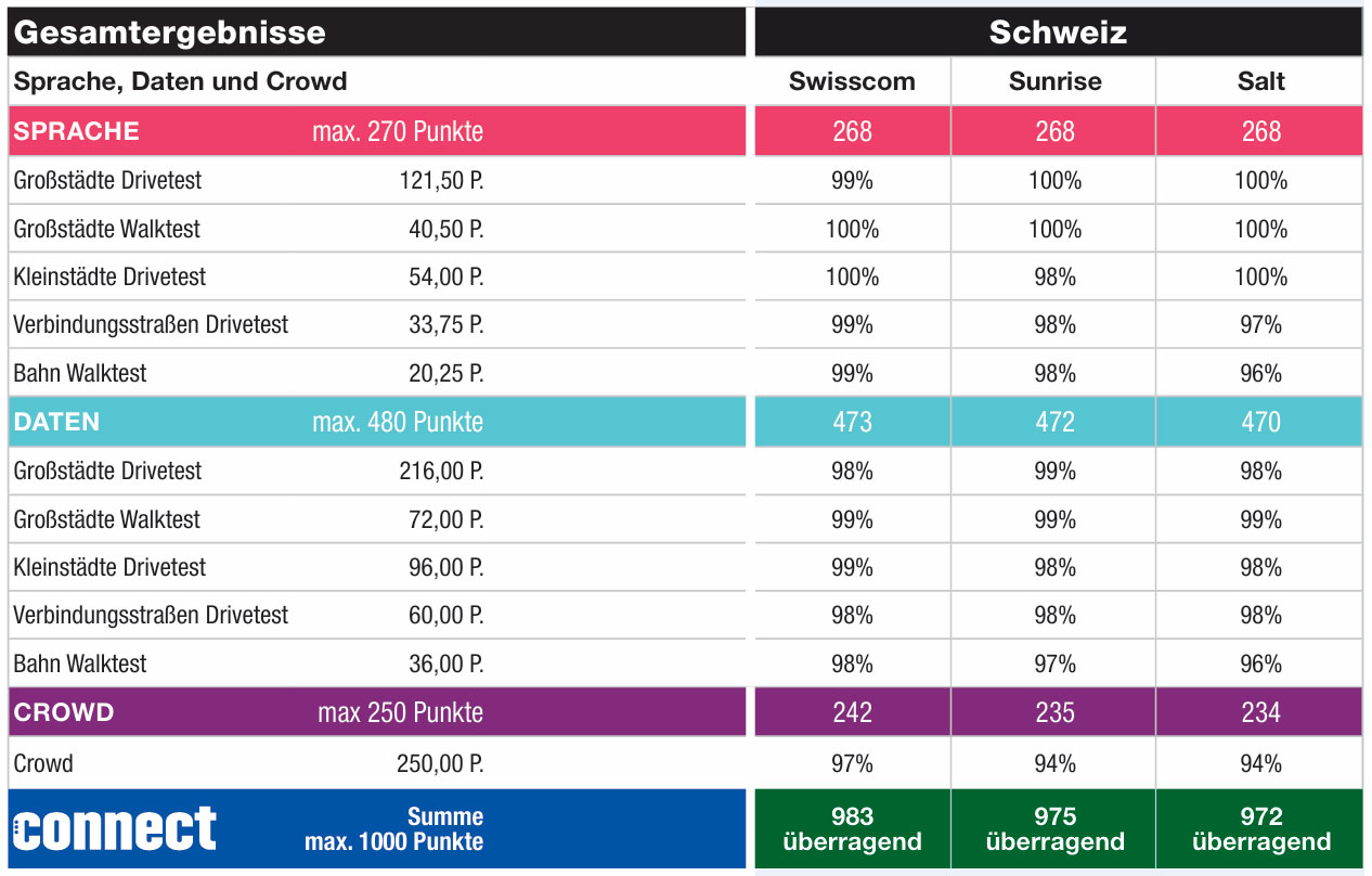 Swisscom den jährlichen Mobilfunknetztest der Zeitschrift "Connect" für sich entscheiden. Dabei holt Swisscom nicht nur innerhalb der Schweiz die höchste Punktzahl, sondern auch im Vergleich mit den deutschen und österreichischen Providern. In dem grossangelegten Test, den es seit mittlerweile 32 Jahren gibt, werden heuer Messungen zu Datenverbindungen mit 48 Prozent gewichtet, Sprachtelefonie mit 27 Prozent und Testergebnisse von fast 3 Millionen Endanwendern ("Crowd") mit 25 Prozent.