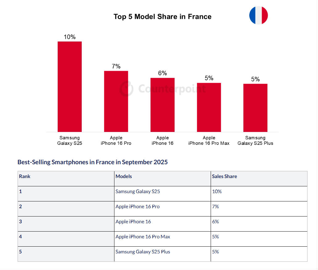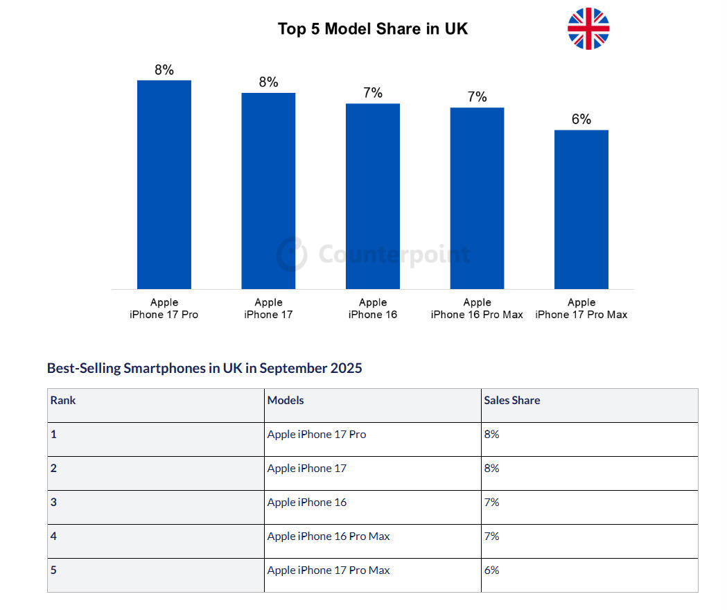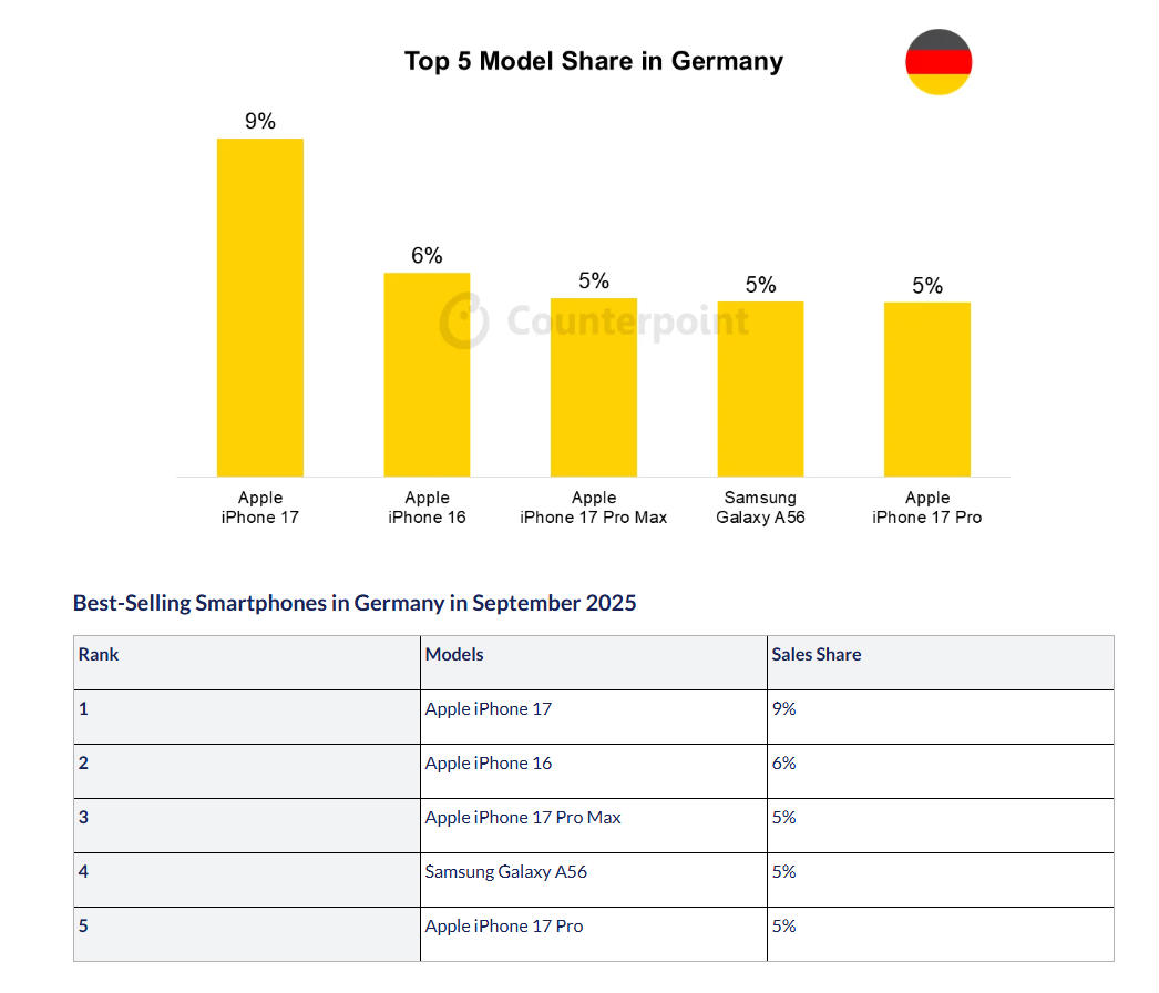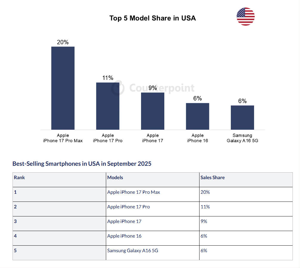 Counterpoint hat ausserdem Zahlen veröffentlicht, die zeigen, welches Smartphone-Modell im September in acht Ländern am häufigsten verkauft wurde. In den USA kommt das iPhone 17 Pro Max dabei auf einen Anteil von 20 Prozent, vor dem iPhone 17 Pro mit 11 und dem iPhone 17 mit 9 Prozent. In China liegt ebenfalls das iPhone 17 Pro Max an der Spitze mit 4 Prozent, vor dem iPhone 17 Pro mit 3 Prozent. In Indien liegt das iPhone 16 auf Platz eins (4%), in Deutschland das iPhone 17 (9%), in den UK das iPhone 17 Pro (8%) und in Japan das iPhone 16e (16%). In Frankreich auf Platz eins liegt das Samsung Galaxy S25 mit 10 Prozent, und in Korea das Samsung Galaxy Z Flip 7 mit 17 Prozent. (mw)