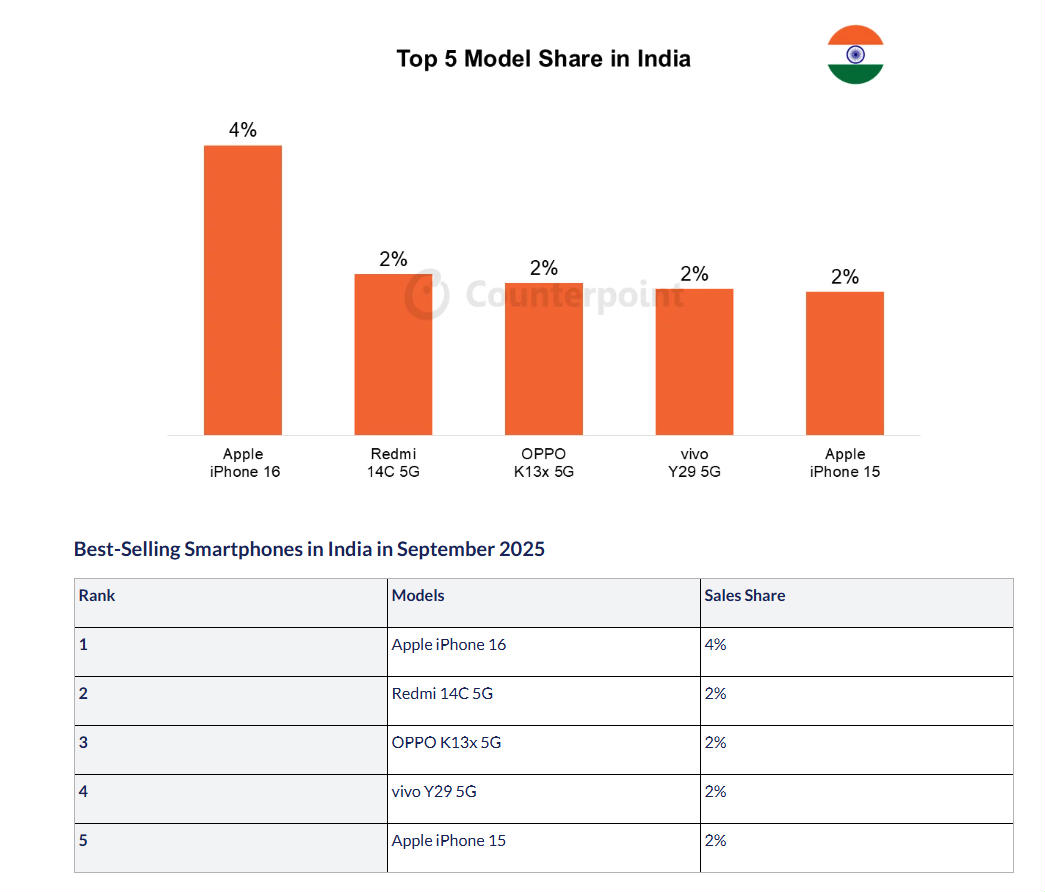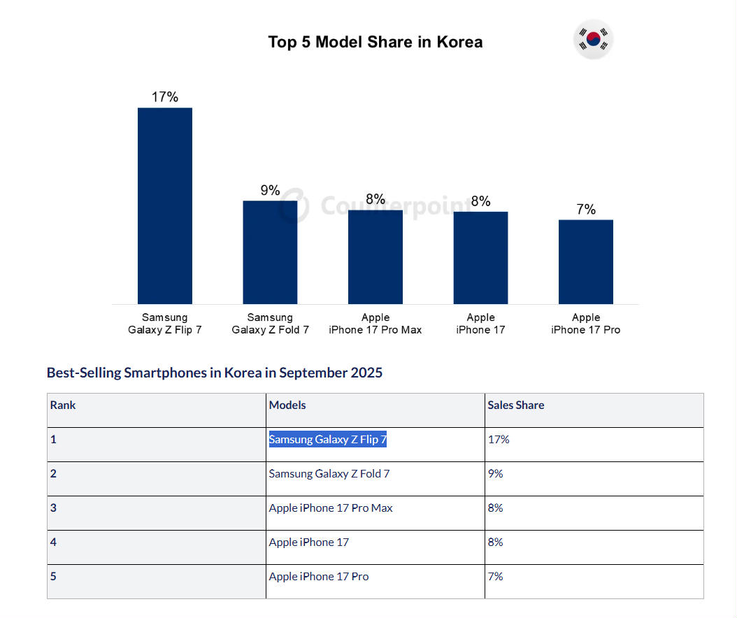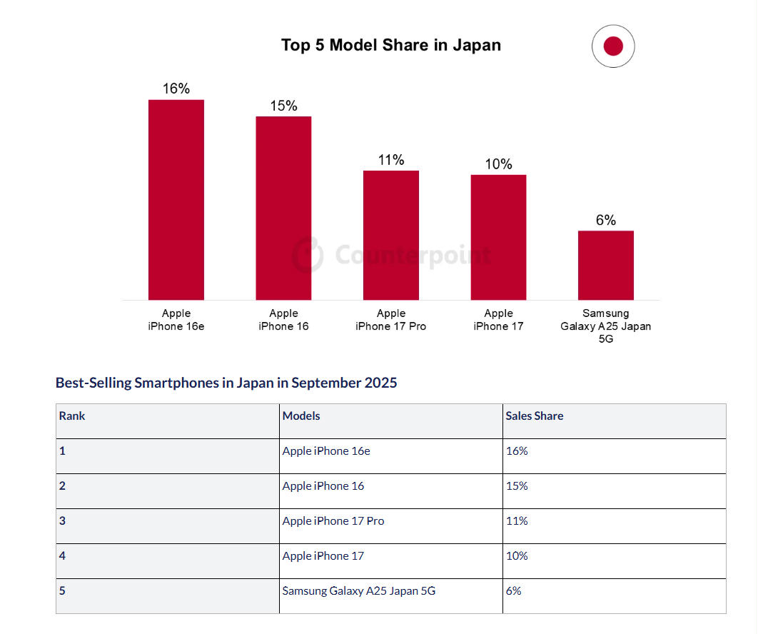 Counterpoint hat ausserdem Zahlen veröffentlicht, die zeigen, welches Smartphone-Modell im September in acht Ländern am häufigsten verkauft wurde. In den USA kommt das iPhone 17 Pro Max dabei auf einen Anteil von 20 Prozent, vor dem iPhone 17 Pro mit 11 und dem iPhone 17 mit 9 Prozent. In China liegt ebenfalls das iPhone 17 Pro Max an der Spitze mit 4 Prozent, vor dem iPhone 17 Pro mit 3 Prozent. In Indien liegt das iPhone 16 auf Platz eins (4%), in Deutschland das iPhone 17 (9%), in den UK das iPhone 17 Pro (8%) und in Japan das iPhone 16e (16%). In Frankreich auf Platz eins liegt das Samsung Galaxy S25 mit 10 Prozent, und in Korea das Samsung Galaxy Z Flip 7 mit 17 Prozent. (mw)