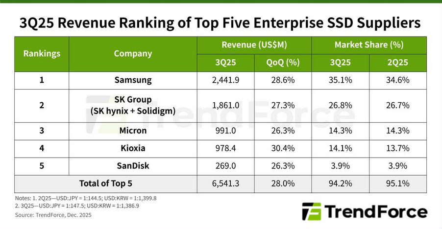 Der Markt für Enterprise SSDs hat im dritten Quartal massiv zulegen können, wie eine Studie von Trendforce belegt. Die KI-bedingte Nachfrage habe zu einem deutlichen Umsatzwachstum geführt und allein die Einnahmen der Top 5 Hersteller seien gegenüber Vorjahr um 28 Prozent auf 6,54 Milliarden Dollar angestiegen, was einem neuen Rekord entspreche.