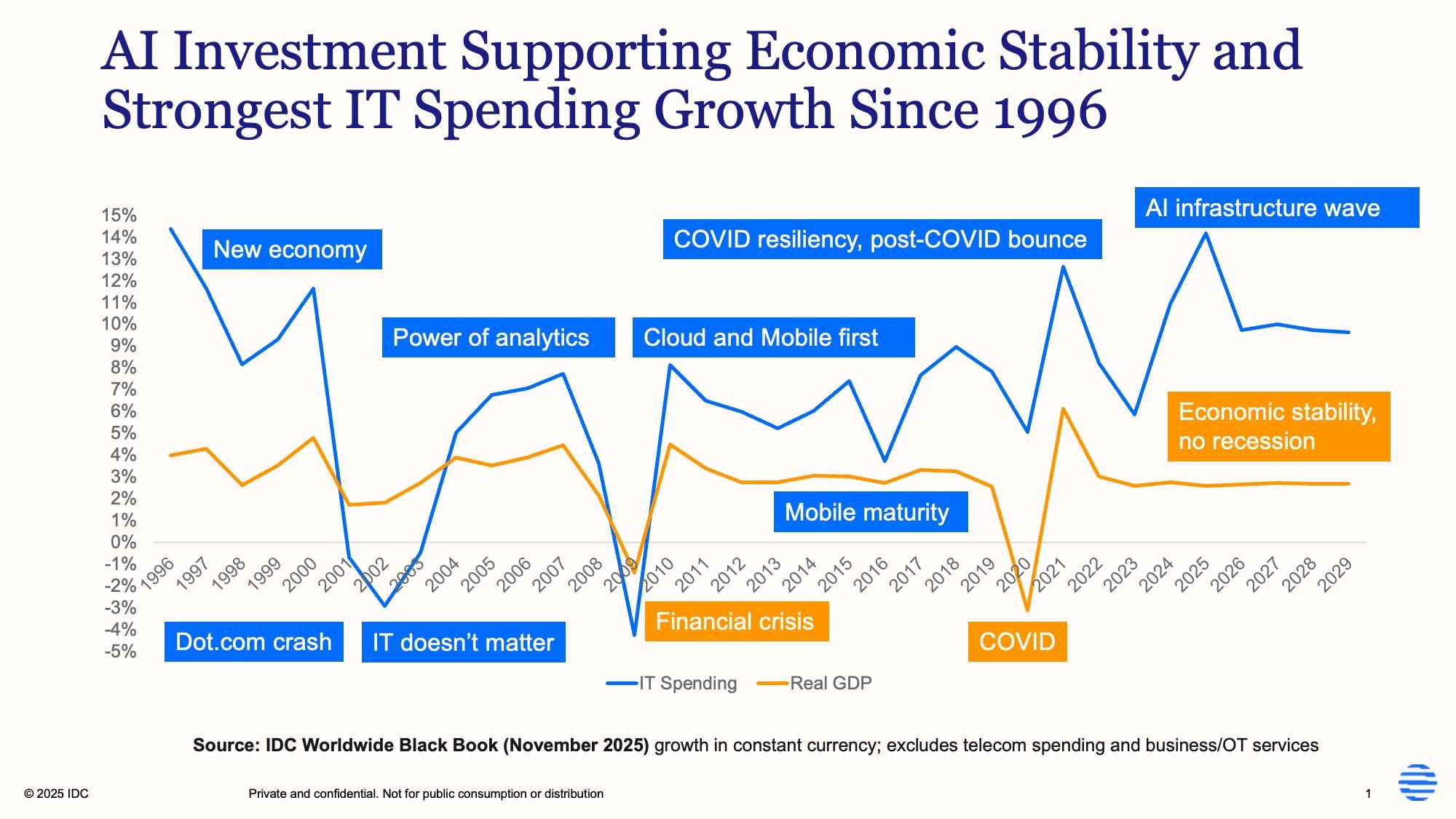 "Die Aussichten für 2026 sind mit Gegenwind und Abwärtsrisiken behaftet, darunter ein erwarteter Mangel an Speicherkomponenten, der die PC-Preise im nächsten Jahr in die Höhe treiben könnte", so Minton. "Die Nachfrage nach Technologie war in diesem Jahr trotz der Unsicherheit hinsichtlich der Zölle und der schleppenden Weltwirtschaft robust, aber unsere Basisprognose geht von einer stabilen Wirtschaft aus, die zum Teil durch anhaltende Investitionen in KI gestützt wird." Selbst in einer moderaten Rezession würden die meisten IT-Ausgaben weiterlaufen. Die Wahrscheinlichkeit eines "perfekten Sturms" ähnlich dem IT-Marktcrash von 2001 bleibt demnach gering.