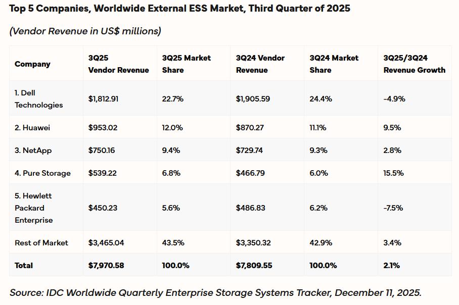 Pure Storage erreichte dank zweistelligem Wachstum (+15,5 %) einen Marktanteil von 6,8 Prozent und Platz vier. Hewlett Packard Enterprise komplettierte die Top fünf mit einem Anteil von 5,6 Prozent.