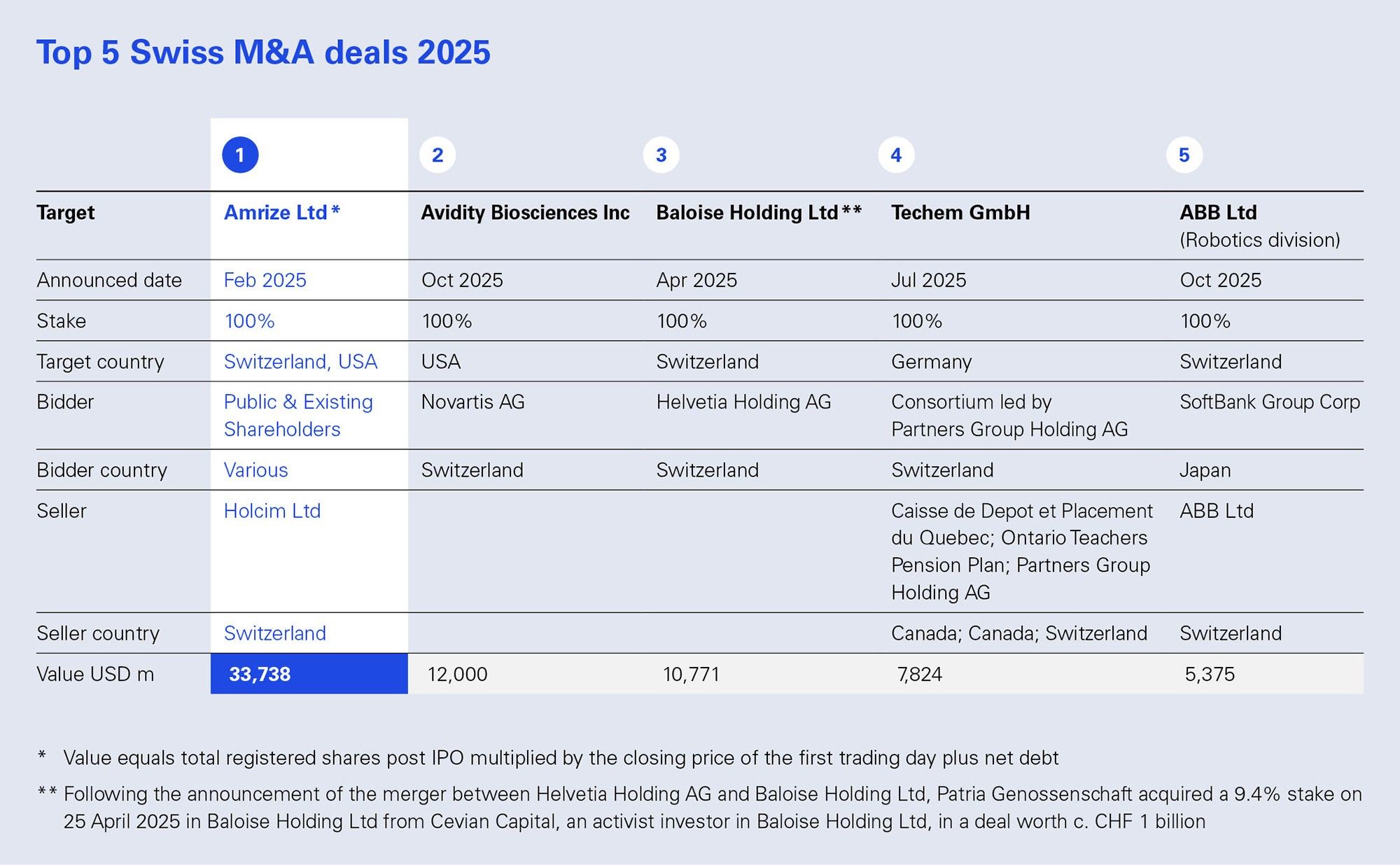 Für 2025 kann der Schweizer Markt insgesamt 502 M&A-Transaktionen mit einem gesamten Deal-Volumen von 166,8 Milliarden US-Dollar vorweisen. 2024 waren es noch 464 Transaktionen mit insgesamt 115,1 Milliarden Dollar. Trotz des Zuwachses bleibt der Markt aber leicht hinter den Erwartungen zurück, wie die Marktanalysten von