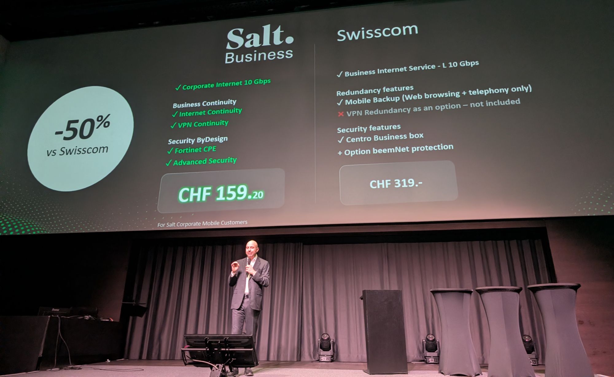 Auf einer Launch-Veranstaltung Ende Januar in Zürich hat Salt wenig Zweifel daran gelassen, welchem Wettbewerber der Provider mit dem neuen Angebot Marktanteile abknöpfen will. Corporate Internet sei um die Hälfte günstiger als ein vergleichbares Angebot von Swisscom, rechnete Nunzianta auf der Bühne vor. Zwar steige man später in den Bereich ein als andere Anbieter, verfolge mit der Bündelung von Konnektivität, Continuity und Cybersecurity aber einen Ansatz, mit dem man sich von der Konkurrenz abhebe. Der CEO spricht von einer "Demokratisierung von Technologien", die bisher grossen Unternehmen vorbehalten waren, und bekräftigt: "Wir sind überzeugt, dass Swisscom in Vergangenheit nicht genügend herausgefordert wurde."