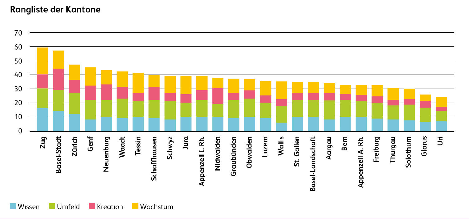 Wie bereits bei der Erstausgabe liegt Zug auch heuer an der Spitze des Index, vor Basel-Stadt und Zürich. Zug behauptet laut den Studienverfassern seine Spitzenposition dank starker Werte bei Unternehmensgründungen, Wirtschaftswachstum und günstigen Rahmenbedingungen wie steuerlichen Anreizen. Basel-Stadt überzeigt im Kulturbereich und nimmt eine führende Rolle bei der Diversität ein. Zürich erzielt in nahezu allen Bereichen konstant gute Resultate und präsentiert sich als breit aufgestellter Kanton.