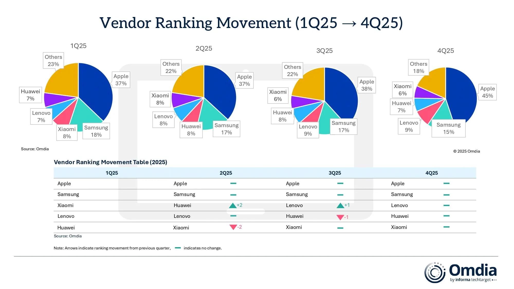 Bei den Herstellern führte Apple laut der Studie im vierten Quartal 2025 das Feld an und lieferte 19,6 Millionen iPads aus, ein Plus von 16,5 Prozent. Auf Platz zwei folgt Samsung mit 6,4 Millionen Geräten, was einem Rückgang von 9,2 Prozent entspricht, während Lenovo mit 3,9 Millionen ausgelieferten Tablets um 36 Prozent zulegte. Huawei kam laut den Zahlen auf 3 Millionen Einheiten plus 14,8 Prozent und Xiaomi auf 2,8 Millionen Einheiten plus 10,1 Prozent.